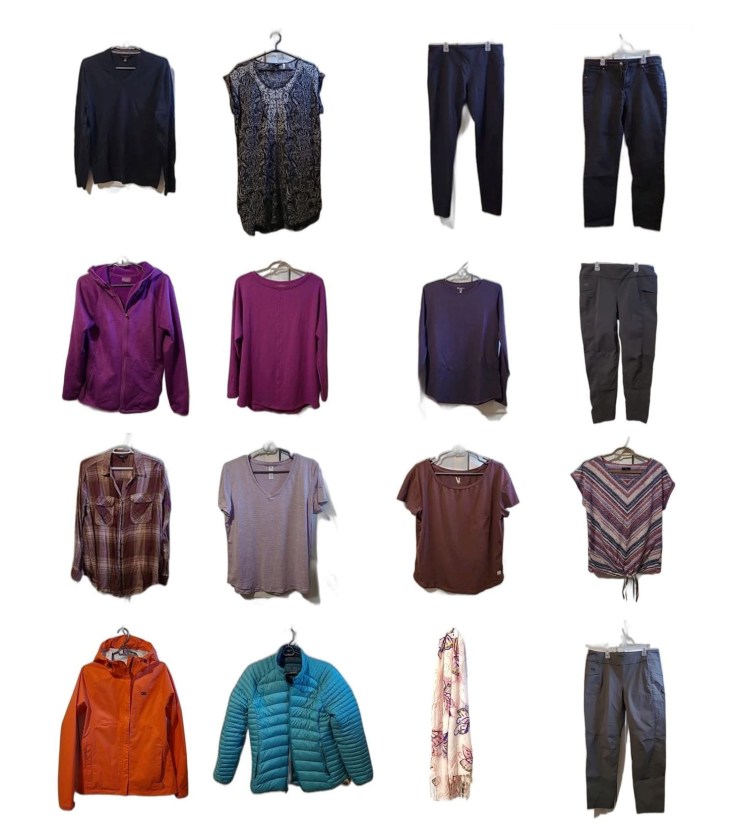 In the “four-by-four wardrobe” I used, my first core colour was black, my second purple (which isn’t a neutral but worked for me), and the rest, other than my rain jacket and puffer jacket, were shades of purple, grey and maroon. And other than the basics (underwear, bras, socks, pjs), the clothes you see in the photo below is all I packed.